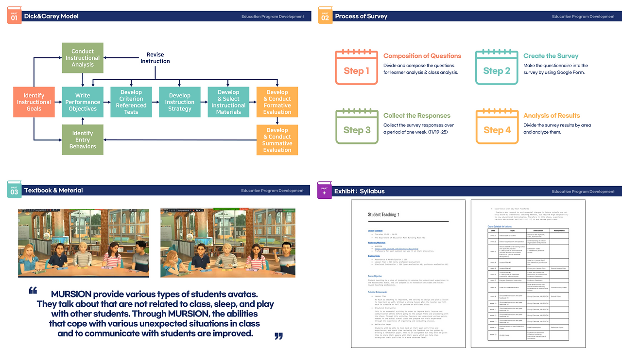 Our team wanted to renovate a specific course where students would have to go and teach in actual schools without any preparation. We used the Dick and Carrey model to guide ourselves along the process, and conducted surveys about the original course so that we could design the new program with enough information about the needs of the students.